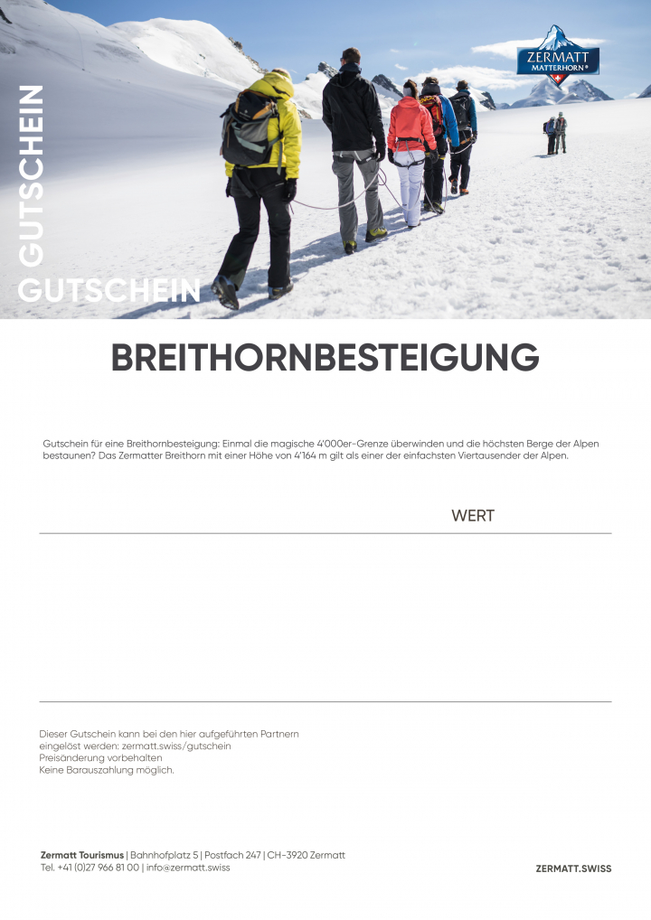 Gutschein für eine Breithornbesteigung: Einmal die magische 4'000er-Grenze überwinden und die höchsten Berge der Alpen bestaunen? Das Zermatter Breithorn mit einer Höhe von 4'164 m gilt als einer der einfachsten Viertausender der Alpen.